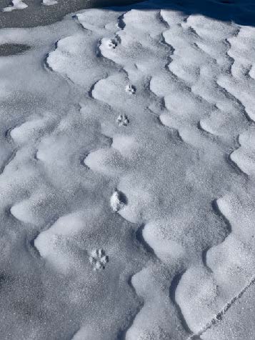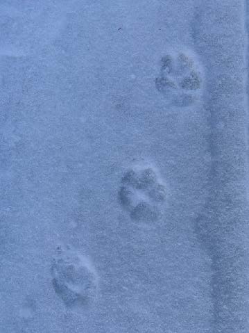Fox and coyote as canines leave a generally straight line of tracks when walking or trotting. You will also usually see toenail marks in canine tracks, look at more than just one track to be sure as depending on the snow depth sometimes the nails show and sometimes, they do not. Domestic dog tracks look very similar to coyote and fox but the spacing between the toepads is usually wider than their wild cousins. Why? They are usually overweight, too many treats lead to wider spaced toes!